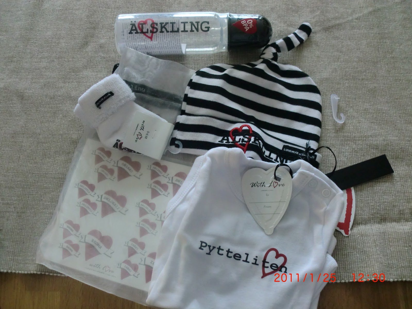 Bebisen har fått sina första presenter:)) Längtar massor till att vi kan börja använda dem. Engla frågar hela tiden när bebisen ska komma. Hon lägger huvet på min mage och säger till bebisen att vakna...Gullunge! Hon gillar när den sparkas därinne!